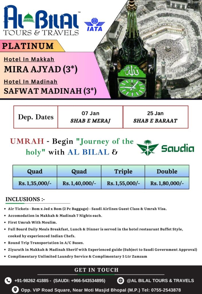 Al Bilal Tours & Travels ✈️ presents the Platinum Umrah Package 2026, designed for premium comfort, personalized services, and a seamless spiritual journey. Experience Umrah with luxury and peace of mind.