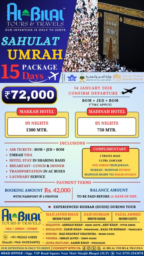 Al Bilal Tours & Travels ✈️ presents 15 Days Umrah Packages 2026 with departure on 14 January (1447H / 2026). Enjoy a smooth, guided, and comfortable Umrah journey.
