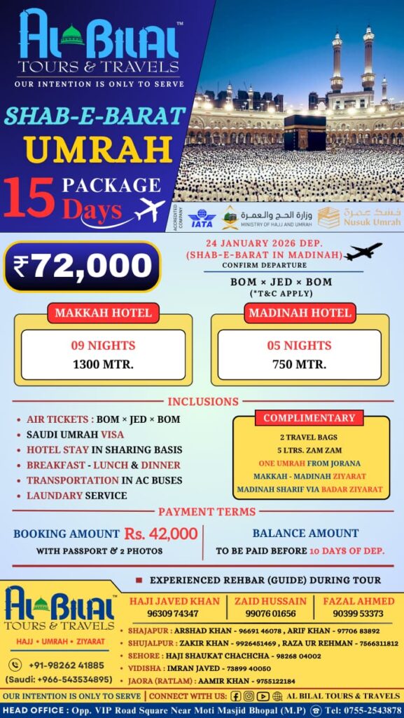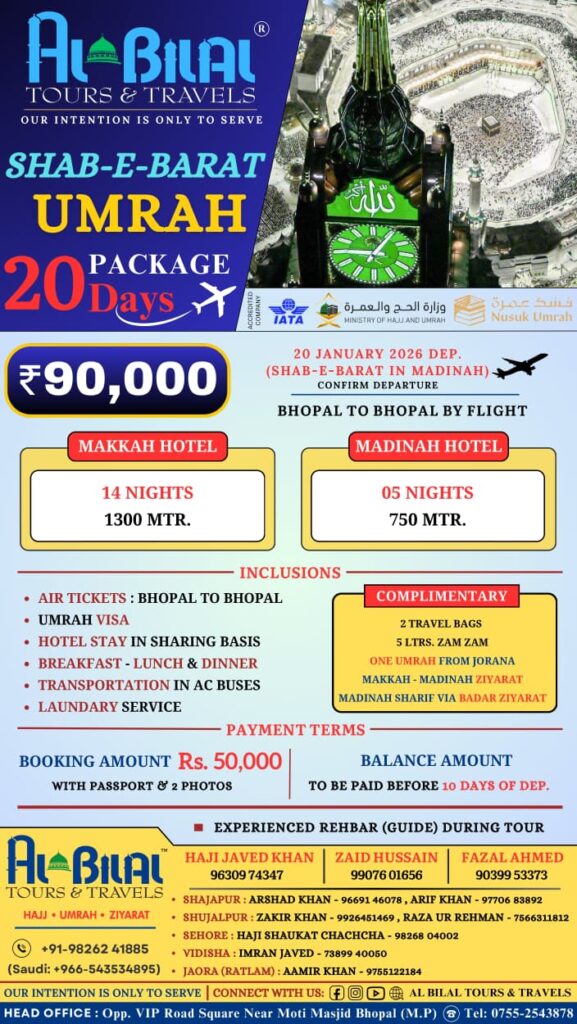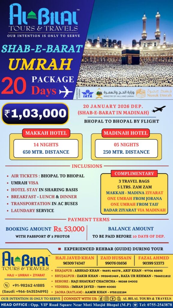 Al Bilal Tours & Travels ✈️ offers 20 Days Shab-e-Barat Umrah Packages 2026 with departure on 20 January (1447H / 2026). Enjoy a smooth, guided, and spiritually enriching journey.