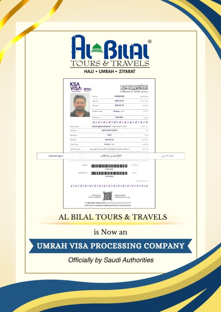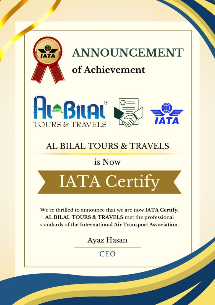 Al Bilal Tours & Travels proudly marks key milestones in excellence. We are an official Umrah Visa Processing Company approved by Saudi Authorities and a certified IATA member, reflecting our commitment to trusted services, international standards, and reliable pilgrimage travel solutions.